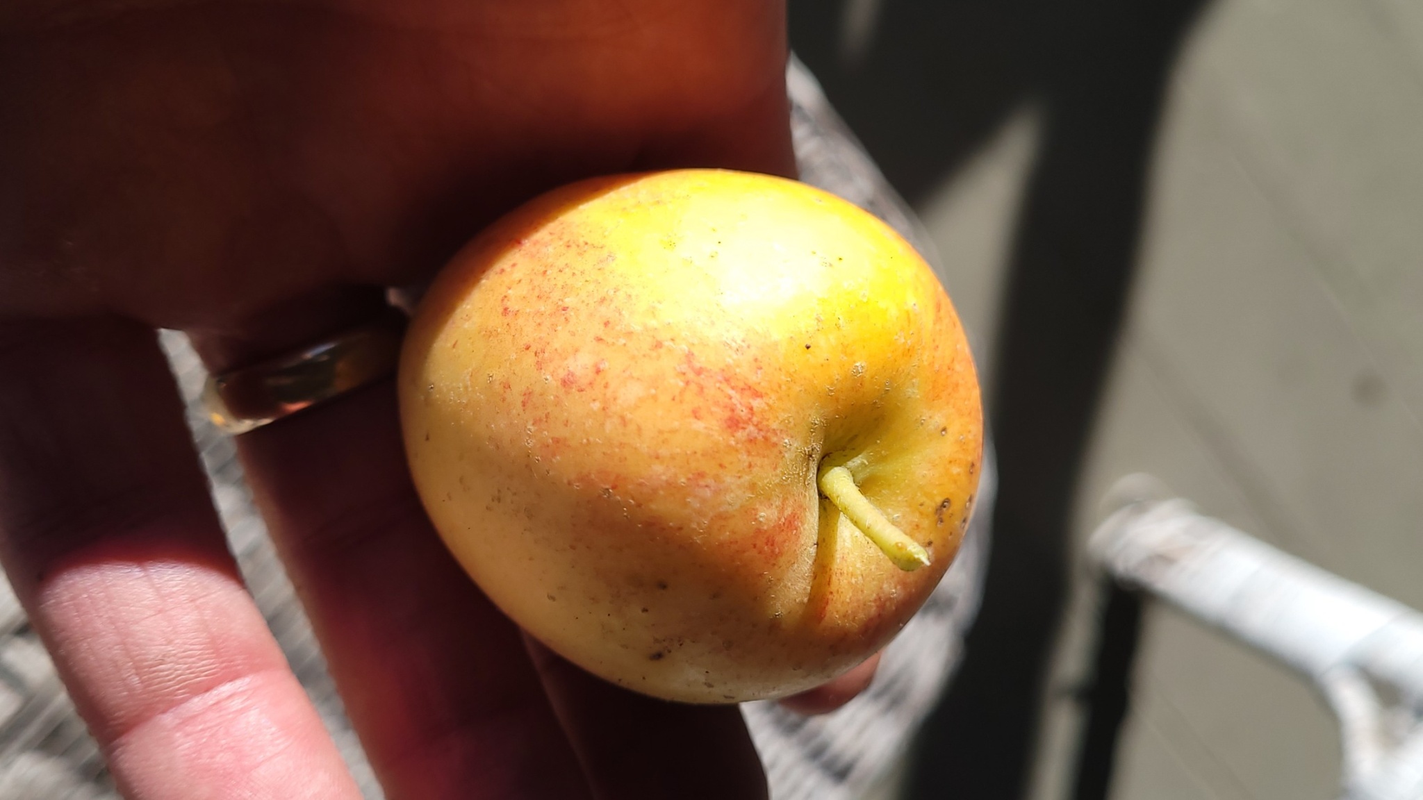 First apple from my "Opal 6" seedling. A bit small, but looks nice. Not quite ripe yet. This one is grafted, but I put the parent in the ground.