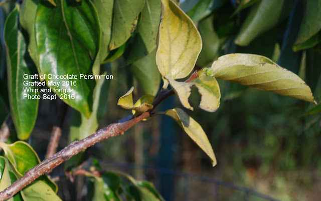 Chocolate Persimmon scion grafted onto Saijo persimmon. Graft took, but limited growth first year. Leaves and stem are quite differeint from Saijo.